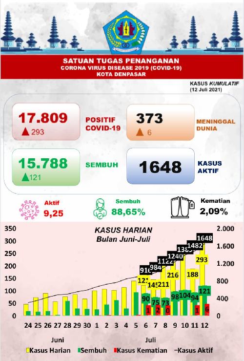 Denpasar (Penabali.com) – Perkembangan harian kasus Covid-19 di Kota Denpasar per hari Senin (12/07/2021), untuk pasien yang sembuh bertambah 121 orang. Kendati demikian, jumlah terkonfirmasi positif masih cukup tinggi dan hari ini bertambah 293 orang. Sedangkan kasus kematian juga terjadi dimana 6 orang dilaporkan meninggal dunia.