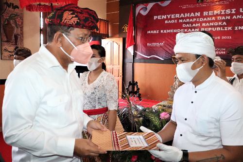 Remisi tersebut diserahkan secara simbolis oleh Wakil Bupati Buleleng I Nyoman Sutjidra di Aula Lapas IIB Singaraja, Selasa (17/8/2021).