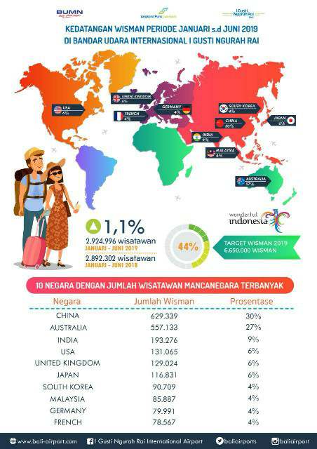 Catatan jumlah turis asal Negeri Kanguru sebanyak 113.654 jiwa cukup jauh mengungguli jumlah 106.202 turis asal Cina. Sepanjang semester pertama tahun 2019 ini, Bandar Udara Internasional I Gusti Ngurah Rai melayani beberapa rute internasional baru, baik dari maskapai yang sebelumnya sudah beroperasi menghubungkan wisatawan dunia ke Bali, maupun maskapai yang benar-benar baru membuka rute penerbangan ke Bali.