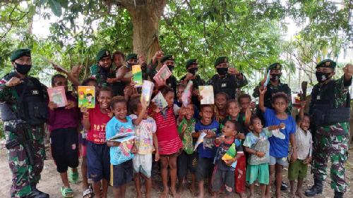 Dalam upaya membantu pemerintah untuk mencerdaskan bangsa khususnya untuk anak-anak di Papua, Satgas Pamtas RI-PNG Yonif Mekanis Raider 413 Kostrad Pos Koya Koso membagikan buku tulis dan buku bacaan kepada anak-anak Kampung Koya Koso Distrik Muara Tami Kota Jayapura.