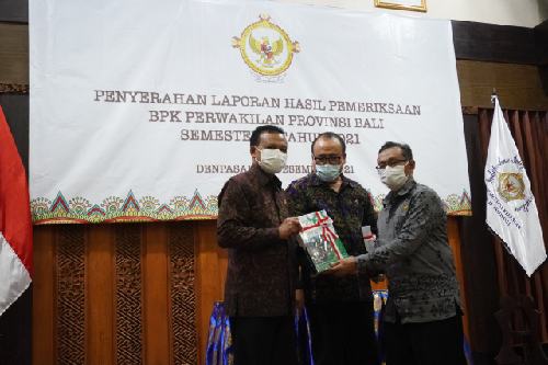 Denpasar (Penabali.com) – Penyerahan Laporan Hasil Pemeriksaan Semester II Tahun 2021 oleh BPK Perwakilan Provinsi Bali kepada Pemerintah Provinsi Bali dan Pemerintah Kota Denpasar, Pemerintah Kabupaten Badung, Kabupaten Gianyar, Kabupaten Jembrana, Kabupaten Karangasem, dan Kabupaten Klungkung serta BPK Perwakilan Provinsi Bali menyerahkan Laporan Hasil Pemeriksaan Kinerja dan Efektifitas Pengelolaan Keuangan Hibah Pemilihan Kepala Daerah Serentak Tahun 2020 pada Komisi Pemilihan Umum Kabupaten Tabanan, Kabupaten Bangli dan Badan Pengawas Pemilihan Umum Provinsi Bali, Kabupaten Tabanan, Kabupaten Bangli, dan instansi terkait lainnya tahun Anggaran 2019 s.d. 2021. Penyerahan dilaksanakan di Aula Lantai I Kantor BPK Perwakilan Provinsi Bali, Selasa (14/12/2021).