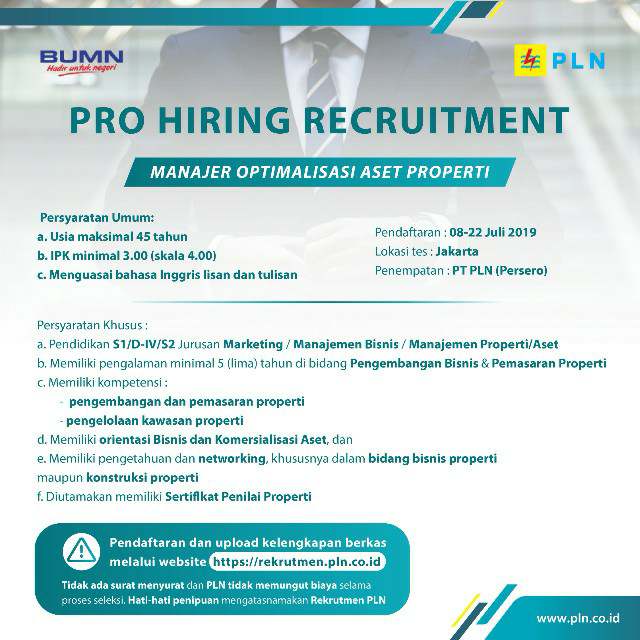 Saat ini PLN juga sedang membuka lowongan untuk posisi Manajer Optimalisasi Aset Properti. Pendaftaran dapat dilakukan melalui situs rekrutmen.pln.co.id hingga 22 Juli 2019 mendatang. (red)
