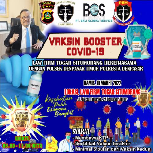 Denpasar (Penabali.com) – Menggandeng Polresta Denpasar dan Polsek Denpasar Timur, Law Firm Togar Situmorang akan menggelar serbuan vaksinasi booster, bertempat di Jalan Gatot Subroto Timur No. 22 Denpasar, pada Kamis 10 Maret 2022.
