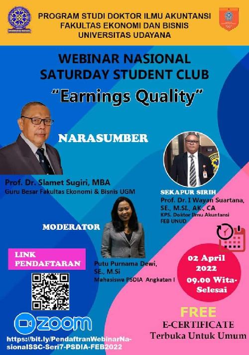(Penabali.com) – Diinformasikan kepada seluruh Mahasiswa/i Fakultas Ekonomi dan Bisnis Universitas Udayana bahwa Program Studi Doktor Ilmu Akuntansi Fakultas Ekonomi dan Bisnis Universitas Udayana akan melaksanakan kegiatan Webinar Nasional Saturday Student Club (SSC) dengan tema “Earnings Quality”.