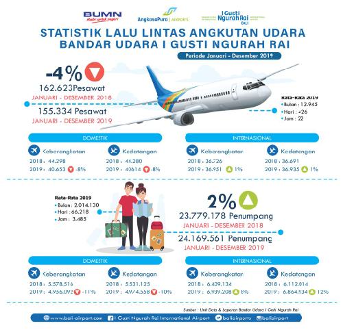 Mengawali tahun 2020, PT Angkasa Pura I (Persero) selaku pengelola Bandar Udara Internasional I Gusti Ngurah Rai merilis data statistik Lalu Lintas Angkutan Udara (LLAU) tahun operasional 2019. Data yang dirilis pada Senin (06/01/2020) tersebut mencakup jumlah pergerakan pesawat udara serta jumlah penumpang selama periode pencatatan di 12 bulan berjalan di tahun 2019.