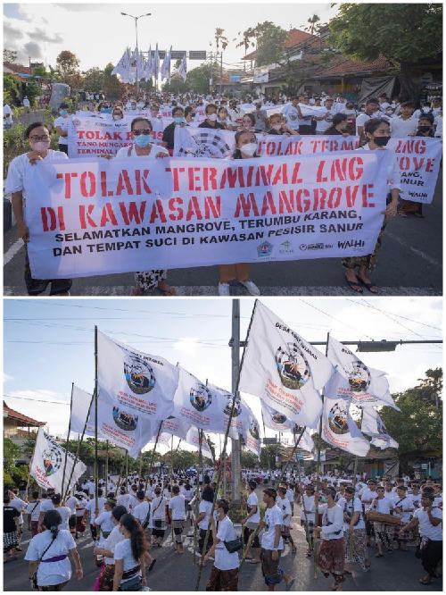 Kegiatan ini diikuti ribuan massa diiringi baleganjur, lelancingan serta poster, bendera, dan spanduk yang bertuliskan Tolak Pembangunan Terminal LNG di Kawasan Mangrove. (rls)