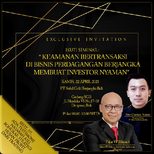 PT Solid Gold Berjangka (SGB) Bali bersama dengan PT Kliring Berjangka Indonesia (Persero) mengadakan seminar bertajuk “Keamanan Bertransaksi di Bisnis Perdagangan Berjangka Membuat Investor Nyaman”. Acara ini dilaksanakan di Kantor SGB Bali di Denpasar, Kamis (22/04/2021).