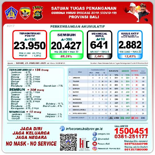 Penabali.com – Satuan Gugus Penanganan Covid-19 Provinsi Bali melaporkan perkembangan Covid-19 dimana junlah yang sembuh bertambah 306 orang.