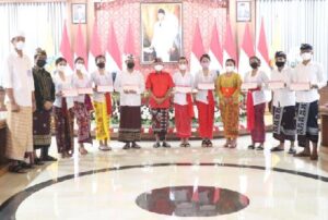 Gubernur Koster bersama siswa dan mahasiswa penerima Keyboard Aksara Bali. (foto: ist.)