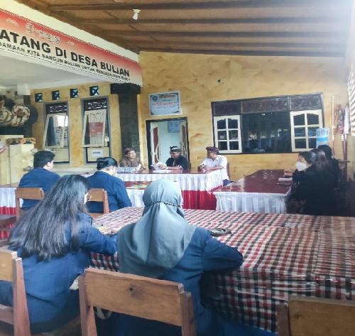 Pelaksanaan observasi ini merupakan langkah awal dalam pelaksanaan KKN PPM di Desa Bulian yang dihadiri 8 perwakilan mahasiswa, Dr. I Wayan Sumardika selaku dosen pembimbing lapangan (DPL), I Made Sudirsa selaku kepala desa dan I Made Sudira selaku sekretaris desa.