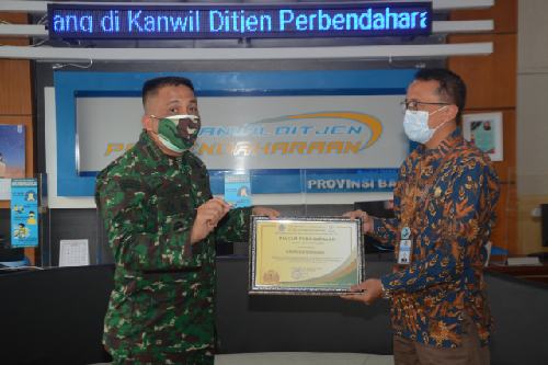Penghargaan tersebut diserahkan Plh. Kepala Kantor Wilayah Direktorat Jenderal Perbendaharaan Provinsi Bali, Benediktus Didik Aribawa, dan diterima langsung Asisten Perencanaan Kodam IX/Udayana Kolonel Arm Johanes Toar Pioh, saat silahturahmi ke Kantor Kakanwil Dirjen Perbendaharaan Provinsi Bali, Selasa (21/9/2021) di Basement Aula Barat, Gedung Keuangan Negara I, Renon, Denpasar.