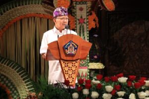 Gubernur Koster saat memberikan sambutan pada acara penyerahan beasiswa di Ksiarnawa, Taman Budaya Denpasar. (foto: ist.)