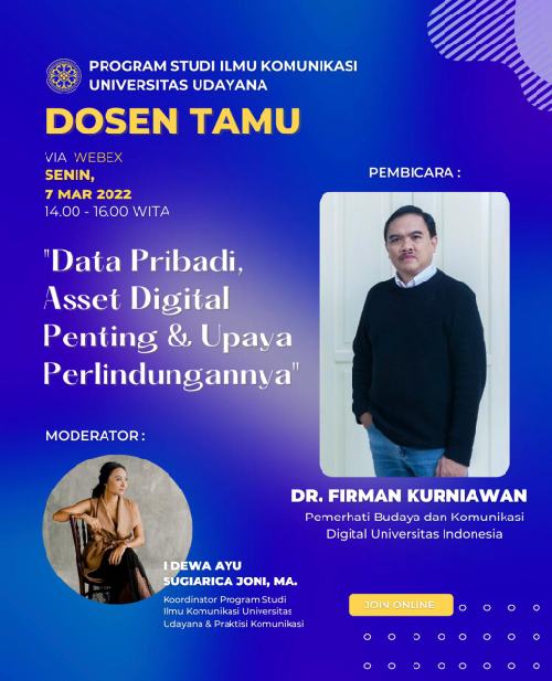 Denpasar (Penabali.com) – Program Studi Ilmu Komunikasi Universitas Udayana menyelenggarakan kuliah dosen tamu melalui webex dengan mengangkat tema “Data Pribadi, Aset Digital Penting & Upaya Perlindungannya”, Senin (07/03/2022).