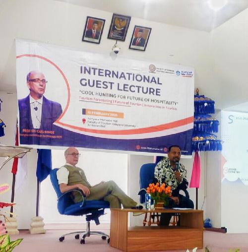 Denpasar (Penabali.com) – Fakultas Pariwisata Unud, Jumat (10/2/2023), menyelenggarakan kuliah tamu dengan narasumber Prof. Carl Rohde dari Shanghai Institute of Technology. Prof. Carl Rohde merupakan seorang ahli forecasting (peramalan) tentang trend dalam dunia industri, termasuk industri pariwisata.