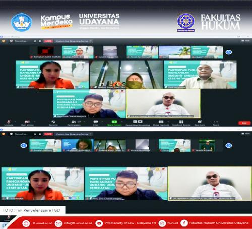 FGD berlangsung selama 2 jam itu, diikuti 173 peserta dalam zoom meeting dan 36 orang melalui live streaming Youtube termasuk para dosen dan mahasiswa dari FH Unud serta Prodi Magister Hukum Kesehatan Pascasarjana Unud. Turut hadir Menteri Kesehatan RI, Ir. Budi Gunadi Sadikin, sekaligus memberikan welcoming speech.