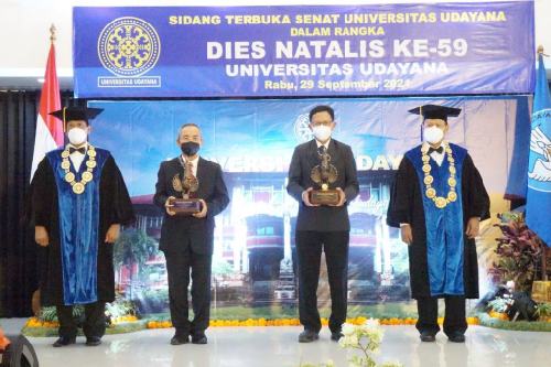 Pada acara puncak Dies Natalis Unud tahun ini, Orasi Ilmiah disampaikan Menko Polhukam, Prof. Mahfud MD dan penyerahan Udayana Award kepada Prof. Dr. dr. Ketut Suastika, Sp.PD-KEMD (mantan Rektor Unud) dan Prof. Dr. Ir. I Gede Mahardika, MS (Fakultas Peternakan). Para penerima Anugerah Udayana dinilai telah banyak berkontribusi untuk kemajuan Unud. (foto: ist.)