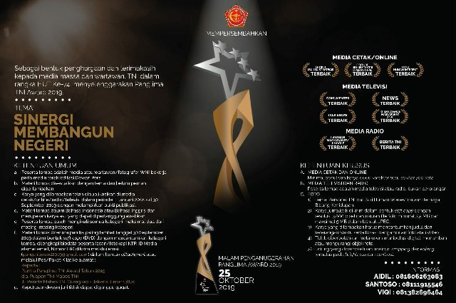 (Puspen TNI). Kolaborasi TNI dengan media massa banyak memberikan manfaat positif hingga institusi TNI semakin dikenal dan dicintai rakyat. Karena itu, sebagai bentuk penghargaan dan terima kasih kepada wartawan media cetak, televisi, radio dan online, TNI menggelar “Lomba Karya Jurnalistik Panglima TNI Award 2019”.