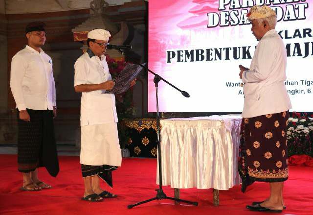 Sebelum pengukuhan, dilakukan deklarasi Pembentukan Majelis Desa Adat sesuai dengan Perda Provinsi Bali No 4 Tahun 2019 tentang Desa Adat di Bali yang sudah diresmikan pemberlakuannya tanggal 4 Juni 2019 lalu di tempat yang sama. Pengurus terpilih merupakan hasil dari Paruman Agung Desa Adat se-Bali yang diikuti 1.493 desa adat se-Bali termasuk pengurus Majelis Madya yang ada di Kabupaten/Kota.