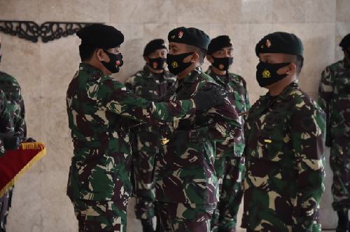 Panglima TNI Marsekal TNI Hadi Tjahjanto, S.I.P., menyematkan secara simbolis tanda penghargaan Satya Lencana Wira Darma kepada 10 perwakilan prajurit TNI dari Yonif Raider 300/Bjw, bertempat di Mabes TNI, Cilangkap, Jakarta Timur, Rabu (12/8/2020).