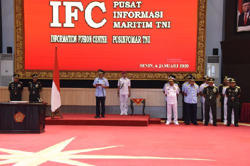 Panglima TNI Marsekal TNI Dr. (H.C.) Hadi Tjahjanto, S.I.P., meresmikan Pusat Informasi Maritim (Pusinfomar) TNI, bertempat di Aula Gatot Soebroto Mabes TNI, Cilangkap, Jakarta Timur, Senin (6/1/2020).