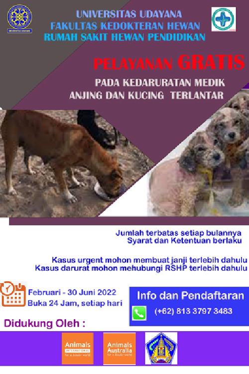 (Penabali.com) – Dalam rangka meringankan beban pemilik hewan terdampak, Rumah Sakit Hewan Udayana bekerjasama dengan Animal Australia mengadakan pengabdian berupa penanganan kedaruratan pada hewan peliharaan secara cuma-cuma mulai Februari sampai 30 Juni 2022.