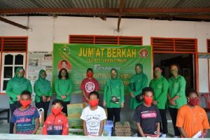 Pelaksanaan kegiatan Jumat Berkah ini, Persit Kartika Chandra Kirana Koorcab (Koordinator Cabang) Korem 174/ATW menyerahkan sembako dan perlengkapan mandi serta membagikan masker di masing-masing panti asuhan yang dituju.
