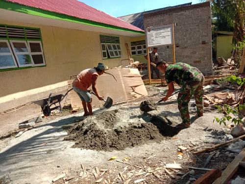 Kebersamaan personel Yonif Raider Khusus 136/Tuah Sakti dan warga binaan terus terjalin, kali ini keharmonisan diantara keduanya tertuang dalam tradisi gotong royong merenovasi sarana dan prasarana SD Inpres 2 Lisabata.
