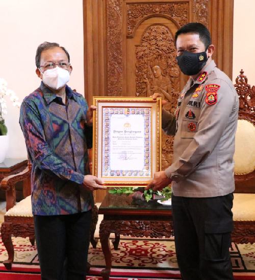 Penghargaan dari Kapolri kepada Gubernur Bali secara resmi diserahkan Kapolda Bali Irjen Pol. Putu Jayan Danu Putra di Jayasabha Denpasar, Jumat (30/07/2021). Penghargaan tersebut berupa piagam bernomor : kep/1088/VI/2021.