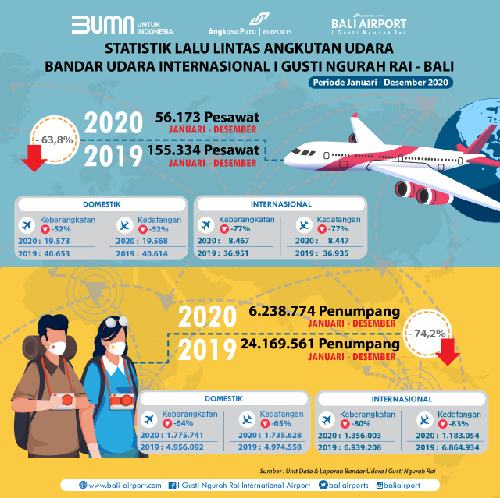 Sedangkan untuk angka pergerakan penumpang, tercatat sebanyak 6.238.774 penumpang terlayani sepanjang tahun 2020. Jika dilakukan perbandingan dengan angka di tahun 2019, dimana sebanyak 24.169.561 penumpang tercatat keluar masuk Bali, maka terdapat penurunan pertumbuhan penumpang sebesar 74,2%.