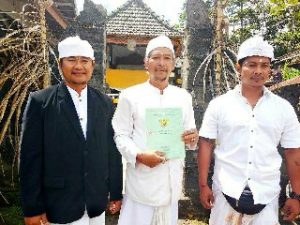 “Kami sekeluarga ingin menyerahkan sertifikat tanah pura yang sebelumnya atas nama ayah kami dan tanahnya memang milik keluarga kami. Ini agar nanti diatasnamakan pura dadia,” kata Wayan Suardana didampingi istri Ni Putu Sriani yang juga anggota DPRD Karangasem.