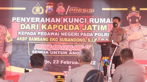 Jawa Timur (Penabali.com) – Kapolda Jawa Timur, Irjen Pol. Nico Afinta, bersama Karo SDM Polda Jatim Kombes Pol. Harry Kurniawan serta Pejabat Utama Polda Jatim, menyerahkan kunci rumah kepada AKBP Bambang Eko Subandono, di Perum The Imperial Havana, Sidoarjo. Selasa (22/2/2022). Hal ini merupakan salah satu bentuk perhatian pimpinan Polri, dalam rangka mensejahterakan anggotanya melalui program Presisi Kapolri.