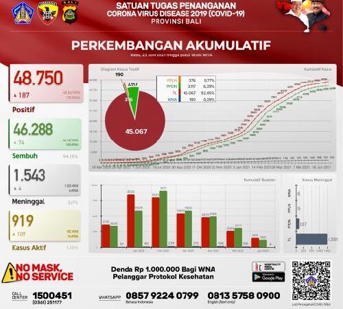 Provinsi Bali (Penabali.com) – Per hari Rabu (23/06/2021), kasus harian Covid-19 di Provinsi Bali terjadi penambahan kasus baru sebanyak 187 orang. Rinciannya, 153 orang terkknfirmasi positif melalui transmisi lokal, 32 orang Pelaku Perjalanan Dalam Negeri…
