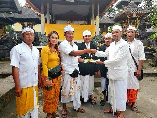 Kelian Dadia Pasek Kayu Selem Banjar Kedungdung Kadek Sember didampingi I Putu Sueta dan I Kadek Sudira bersama Panglingsir Pura Dadia Jro Mangku Made Yadnya dan Jro Mangku Nengah Kersa, menerima sertifikat tanah (palemahan) Pura…