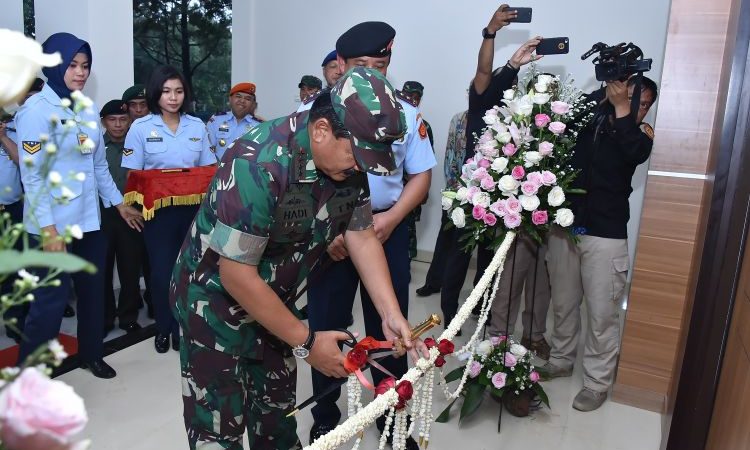 (Puspen TNI). Panglima TNI Marsekal TNI Hadi Tjahjanto, S.I.P., didampingi Aster Panglima TNI Mayjen TNI George Elnadus Supit, S.Sos., Pangkoopsau I Marsda TNI Fadjar Prasetyo dan Pa Sahli Tk. III Bid. Hubint Panglima TNI Marsma…