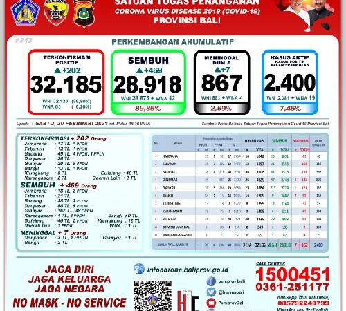 Penabali.com – Selain angka terkonfirmasi positif yang terus bertambah, kasus kematian akibat Covid-19 juga masih tetap terjadi di Provinsi Bali. Per hari Sabtu (20/02/2021), Satgas Penanganan Covid-19 Provinsi Bali melaporkan perkembangan harian kasus Covid-19. Dimana…