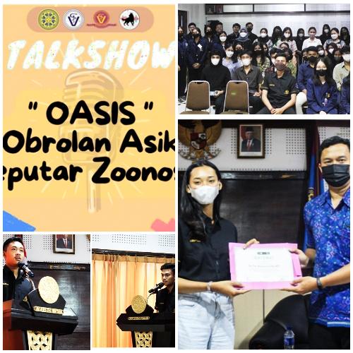Talk show OASIS mendatangkan pembicara drh. Putu Henrywaesa Sudipa, M.Si., dan dimoderatori Adli Parulian Sirait. drh. Putu Henrywaesa Sudipa, M.Si., merupakan seorang dosen aktif dari Fakultas Kedokteran Hewan Universitas Udayana yang mengampu mata kuliah bakteriologi dan mikologi sejak tahun 2017 hingga sekarang. Secara garis besar, beliau menjelaskan bahwa zoonosis adalah penyakit yang disebarkan oleh hewan kepada manusia, juga dari manusia kepada hewan. Tidak hanya salah satu pihak yang menyebarkan, tetapi kedua pihak dapat menyebarkan kepada satu sama lain. (rls)