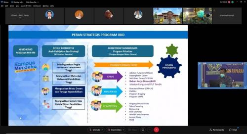Hadir Tim BKD dari Kemendikbudristek sebagai narasumber yaitu Iwan Winardi selaku Koordinator Karier Pendidik dan Tenaga Kependidikan dengan materi Arah Kebijakan BKD Tahun 2021, Prof. Eko Hadi Sujiono dengan materi Matrik Pedoman Operasional BKD tahun 2021, Rizky Tito Prasetyo dengan materi Aplikasi SISTER BKD, Santi Sayanti Agustina dengan materi Pengantar Tes Calon Asesor BKD dan Puput Puspita – Rakhman selaku pemandu tes kompetensi, tes ketrampilan, dan administrasi kegiatan Calon Asesor BKD. (rls)