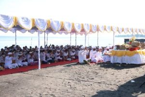 Buleleng (Penabali.com) – Bertepatan Tumpek Landep pada Saniscara Wuku Landep, Sabtu (9/4/2022), Wakil Bupati Buleleng dr. I Nyoman Sutjidra beserta istri Ny. Ida Ayu Wardhani, Ketua DPRD Buleleng Gede Supriatna, Sekretaris Daerah Kabupaten Buleleng Gede Suyasa serta Pimpinan OPD Pemkab Buleleng, melaksanakan upacara Jana Kerthi, di Pura Segara Penimbangan, Sabtu (9/4/2022).