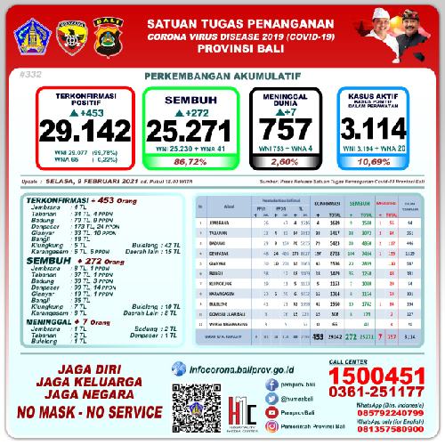 Penabali.com – Perkembangan pandemi Covid-19 di Provinsi Bali per hari Selasa (09/02/2021) mencatat 453 orang penambahan terkonfirmasi positif yang terdiri dari 400 orang melalui transmisi lokal dan 53 Pelaku Perjalanan Dalam Negeri (PPDN).