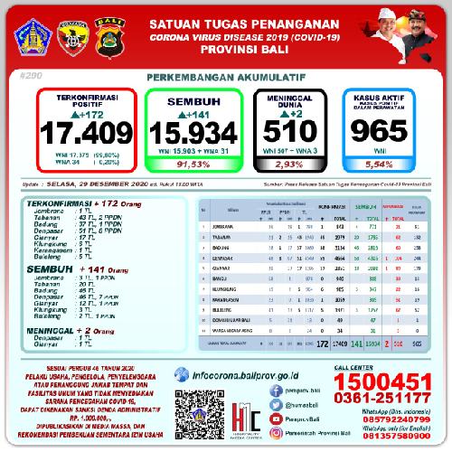 Perkembangan pandemi Covid-19 di Provinsi Bali per hari ini mencatat pertambahan kasus terkonfirmasi positif sebanyak 172 orang (161 orang melalui transmisi lokal dan 11 Pelaku Perjalanan Dalam Negeri (PPDN). Sembuh sebanyak 141 orang, dan 2 orang dilaporkan meninggal dunia.