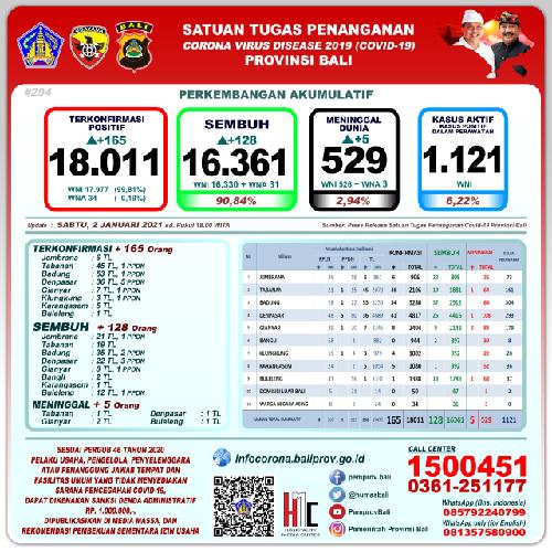 Penabali.com – Perkembangan terkini Covid-19 di Provinsi Bali per hari Sabtu (02/01/2021) mencatat kasus terkonfirmasi positif sebanyak 165 orang, sembuh sebanyak 128 orang, dan 5 orang meninggal dunia.